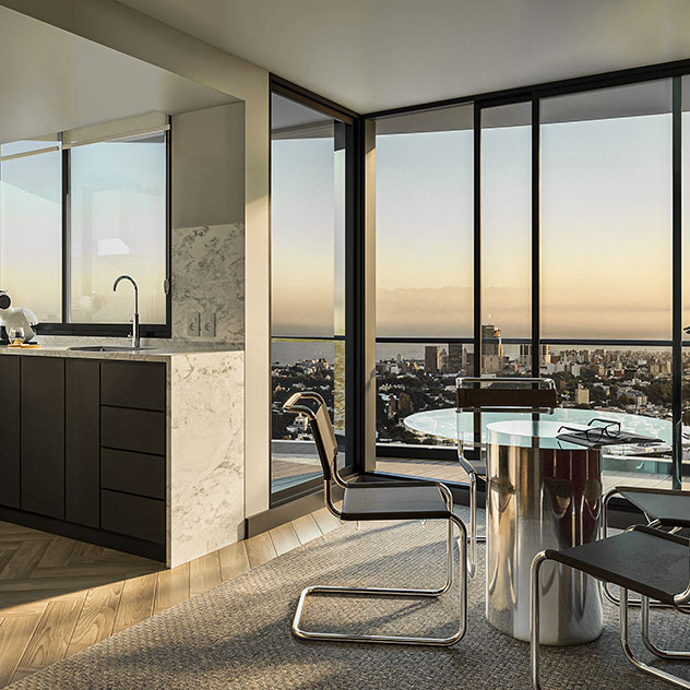 Vivir aquí tiene un plus. En cada apartamento una vista nueva sorprende. De día el horizonte lejano permite alcanzar el mar y un skyline nítido. Las luces de los autos y de los barrios vecinos proponen un juego de claros oscuros cotidianos.